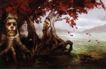 Faces were carved on all the trees of the island to cement the agreement, so that the gods could bear witness to the Pact, giving its name the Isle of Faces. The sacred order of Green Men was established to maintain and keep watch over the Isle of Faces.