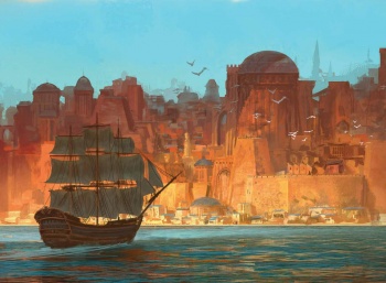Illyrio's three ships sail from Qarth for Pentos with Daenerys, her people, and her three dragons aboard them. During their journey Ser Jorah Mormont counsels Daenerys to sail for Astapor and buy Unsullied. Daenerys heeds his counsel, turning away from the original plan to sail to Pentos.[9]