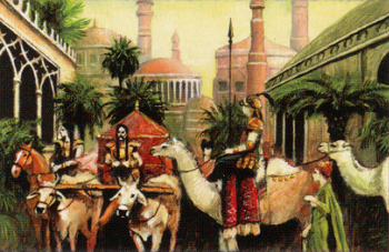 The Qartheen ride camels.[5][16] The riders wear scaled copper armor and snouted helms with copper tusks and long black silk plumes. They sit high on saddles inlaid with rubies and garnets. Their camels are dressed in blankets of a hundred different hues.[5]