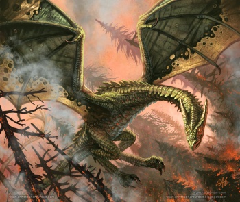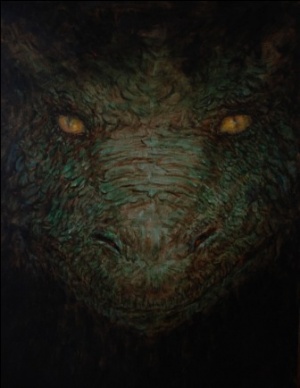 Rhaegal has green and bronze scales.[2] His green scales are a dark green, the green of moss in the deep woods at dusk, just before the light fades, and they gleam like jade. His teeth and claws are black. [3] His eyes are bronze, brighter than polished shields, and they glow with their own heat. His flame is orange-and-yellow fire shot through with veins of green.