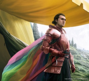 As a second son Robar has to make his own name, so he decides to support Renly Baratheon's claim to the Iron Throne. Renly appoints him to his Rainbow Guard as Robar the Red. When Catelyn Stark attends the feast near Bitterbridge, Lord Bryce the Orange goads him into juggling daggers. On the eve of the battle between the brothers Renly and Stannis Baratheon, Robar escorts Catelyn from Renly's camp to the sept and back.[3]