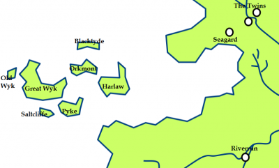 Saltcliffe is one of the islands that make up the Iron Islands. It is located south of Great Wyk and west of Pyke.[1] Noble houses from the island include House Saltcliffe and House Sunderly.[2]