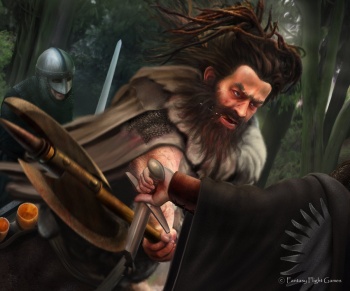 After Tyrion Lannister wins his trial by combat in the Eyrie, Shagga is in Gunthor's band of Stone Crows that Tyrion encounters in the Mountains of the Moon.[4] Shagga agrees to serve Tyrion for pay, and fights in the battle on the Green Fork between the westermen under Lord Tywin Lannister and the northmen under Lord Roose Bolton. Shagga survives several arrows, but is saddened by the death of his friend, Conn.[5]