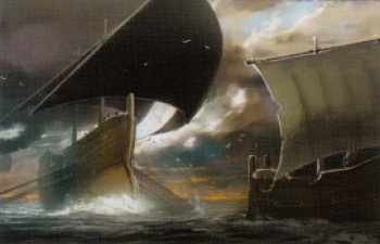 During Robert's Rebellion, longships of the Shield Islands were defeated by House Greyjoy in the battle at the Mander, although Lord Quellon Greyjoy was killed in the battle.[7]