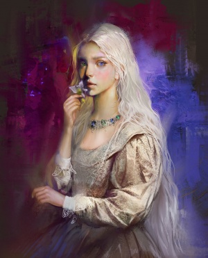 Shiera was renowned as a beauty and seductress, with long Targaryen silver-gold hair, and a heart-shaped face. Although she had two mismatched eyes—one blue, the other green—it was said that the "defect" only enhanced her beauty. She was fond of ivory and lace and cloth-of-silver, but not gold, which she considered too vulgar.[3]