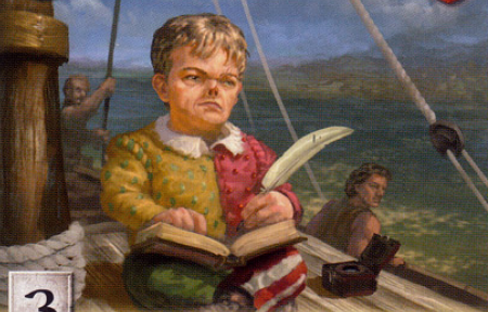 Haldon's is the largest of the ship's four cabins. One wall is lined with bookshelves and bins stacked with old scrolls and parchments; another holds racks of ointments, herbs, and potions. The cabin's round window has yellow glass. The furnishings include a bunk, a writing desk, a chair, a stool, and his cyvasse table, strewn with carved wooden pieces.