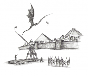 The trebuchets tower forty feet high above the tents of the Yunkai'i and are the Yunkish siege camp's chief landmarks. They are arrayed on three sides of the city, all but the Skahazadhan riverside, and are surrounded by piles of broken stone and casks of pitch resin just waiting for a torch. They are named: