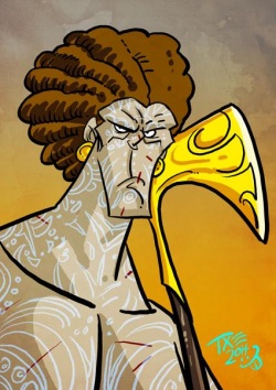 Steelskin is a lean and wiry youth. His cheeks, brow, chest and arms are covered with intricate tattoos in green and black, ancient Valyrian sorcerer's signs that supposedly make his skin and flesh as hard as steel.