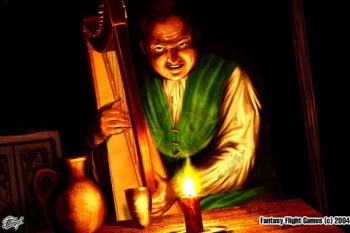 He is short, with thin brown hair, pink cheeks and small pot belly. He uses a twelve-stringed woodharp.[1]