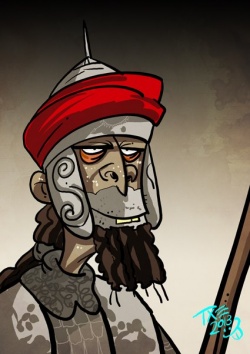 He is swarthy. He is a spearman of the company, and he ties a red silk scarf about his helm.[1]