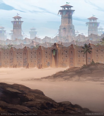 The triple walls of Qarth are three thick walls that surround the ancient port city of Qarth located on the southern coast of Essos. The walls are of thirty, forty, and fifty feet in height, respectively and are engraved with portraits of animals, war, and lovemaking.[1] The three walls of Qarth have not been used for defense in centuries, but they still stand, representing the power of the city.