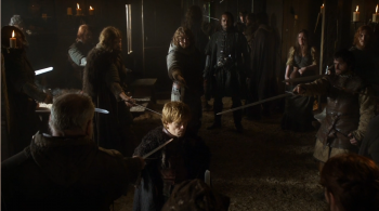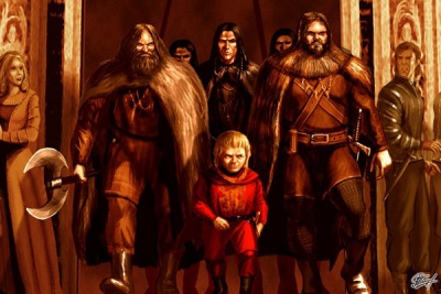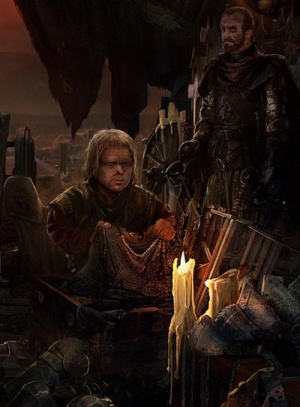 Tyrion goes north to Winterfell as part of King Robert I Baratheon's royal procession.[1] After Bran Stark's fall, Tyrion makes Prince Joffrey Baratheon offer his sympathies to Bran's parents, though his nephew only obeys after Tyrion hits him.[23] Suspicious of the accident, Tyrion takes notice of his siblings' reactions to the news that Bran is expected to survive.[23]