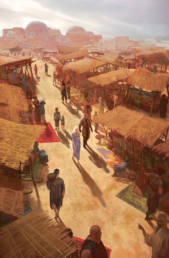 The Western Market and the Eastern Market are the two markets in Vaes Dothrak. The Western Market is a grand bazaar used by traders from the Free Cities. It is a great square of beaten earth surrounded by mud-baked brick, animal pens and whitewashed drinking halls. Hummocks rise from the earth and beneath the square lie large storerooms. The interior of the square is made up of stalls and aisles.[4] In the Eastern Market, traders from Asshai, Yi Ti and the Shadow Lands come to trade. There one can find rarer items, such as manticores, elephants and striped white and black horses (zorses) of the Jogos Nhai.[4]