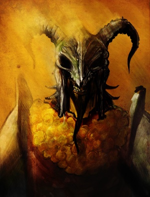Vargo wears a chain of linked coins from all the places where he has fought. The coins are of every shape and size, cast and hammered, bearing the likenesses of kings, wizards, gods, demons, and all manner of fanciful beasts. Vargo rides a zorse. His coat of arms feature the Black Goat of Qohor and he wears a helm shaped as a goat's head.[4]