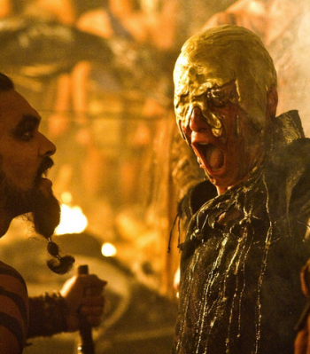 Near "Dragonstone" in the Dothraki sea after fleeing Daznak's Pit atop Drogon,[37] Daenerys dreams of Viserys. Her burnt and gilded brother accuses her of not having mourned him. The siblings argue about Daenerys marriage to Drogo, the delay in Viserys receiving a Dothraki khalasar, and Daenerys receiving dragon eggs from Illyrio. Viserys's jaw falls away as he laughs in the dream.[38]