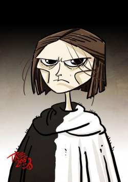 The waif appears to be a pale little girl with a gaunt bony face, hollow cheeks, and very large dark eyes.[3] She wears the cowled robe of a priest of the Faceless Men, black on the right side and white on the left side.[3][2]