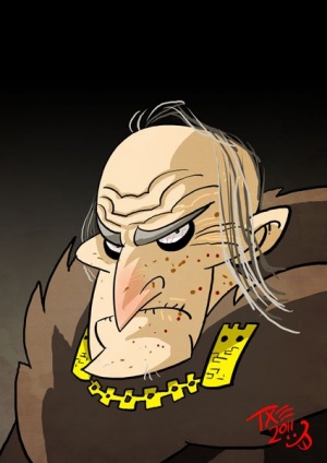 By the age of ninety, Walder has turned bald, and his head has spotted with age.[5][7] He looks a little like a vulture, but mostly like a weasel.[7] Many of his descendants have inherited his weasel-like look.[5][8] Walder's shoulders are scrawny and his long neck pink. He has a receding chin, under which loose skin dangles. He has runny and clouded eyes, and a toothless mouth, which constantly moves.[7] Walder is troubled with gout, and can no longer stand without assistance.[5]