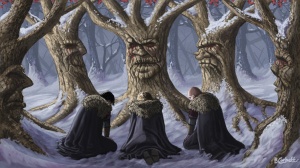 Jon Snow and Samwell Tarly say their Night's Watch vows at a weirwood grove in the haunted forest.[1]