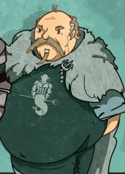 Wylis is a very fat man, bald and with a large walrus mustache. He is quiet and formal.[3] He clasps his cloak with a silver-and-sapphire trident.[4]