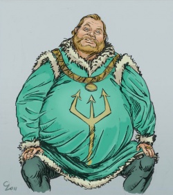 Wyman wears rich clothing, including a velvet blue-green doublet embroidered with golden thread. A golden trident pins his mantle to his shoulder.[9]