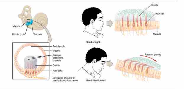The maculae are specialized for sensing linear acceleration, such as when gravity acts on the tilting head, or if the head starts moving in a straight line. The difference in inertia between the hair cell stereocilia and the otolith in which they are embedded leads to a force that causes the stereocilia to bend in the direction of that linear acceleration.