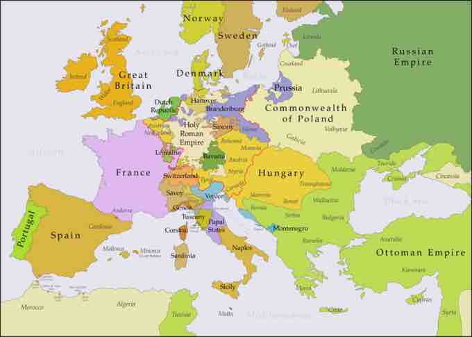 This map shows Europe in the years after the Treaty of Aix-la-Chapelle 1748 and the Seven Years' War (1756-1763). The red line marks the borders of the Holy Roman Empire.