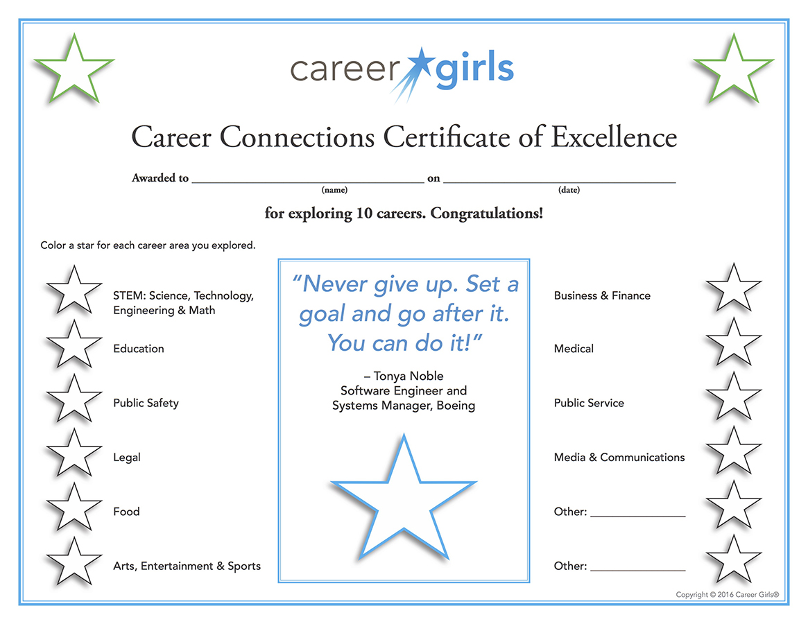 Click here to download a printable Career Connections Certificate for completing a set of 10 different careers. Decorate a star for each career area you explore.