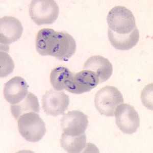 Babesia parasites resemble Plasmodium falciparum, however Babesia has several distinguishing features: the parasites are pleomorphic (vary in shape and size), can be vacuolated, and do not produce pigment.