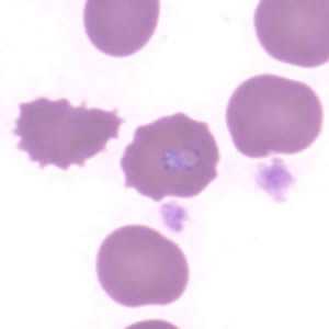Babesia duncani in a thin blood smear stained with Giemsa.
