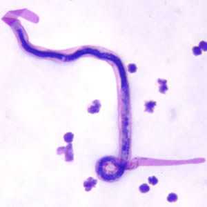 Figure A: Microfilaria of W. bancrofti in a thick blood smear stained with Giemsa. Image courtesy of the Oregon State Public Health Laboratory.