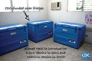 CDC will continue to provide technical and financial support to strengthening immunization services in Haiti. In addition to protecting children in Haiti with life-saving vaccines, these efforts also protect other countries in the Americas from VPD importations. Future projects in Haiti include support for improving valid documentation of vaccine doses administered to children, purchasing of additional solar refrigerators for health facilities, achieving and verifying maternal and neonatal tetanus elimination (Haiti is the only country in the Americas where neonatal tetanus has not been eliminated), and determining the disease burden of chronic hepatitis B virus infection in order to assess the need for introducing a birth dose of hepatitis B vaccine.