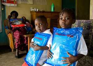 Orphans receive bed nets through the CDC Foundation. These children are among 140 cared for by a group of 25 local widows in the village of Aluor, Kenya, which has been hard-hit not only by the HIV pandemic but also by malaria. © David Synder