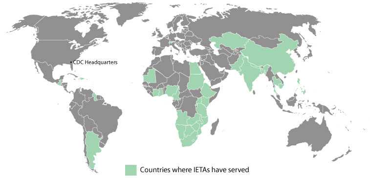 Countries where IETAs have served: India, China, Cambodia, Bangladesh, Kazakhstan, Nepal, Pakistan, Philippines, Saipan, Thailand, Vietnam, Angola, Botswana, Cameroon, Cote d’Ivoire, Egypt, Ethiopia, Ghana, Kenya, Lesotho, Mauritania, Malawi, Mozambique, Namibia, Nigeria, Rwanda, Sudan, South Africa, Swaziland, Tanzania/Zanzibar, Uganda, Zambia, Zimbabwe, Dominican Republic, Trinidad & Tobago, Haiti, Switzerland, Guatemala, Guyana, Argentina