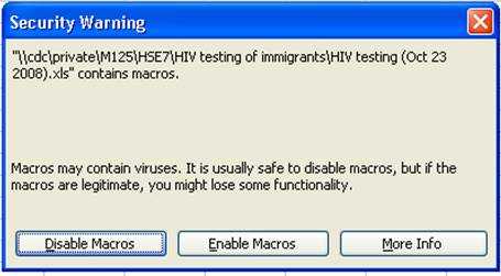 - As the computer is loading Excel (if it is not already loaded) and HIVEcon, a window will pop-up (see figure below), asking you if you want to Disable Macros or Enable Macros. Select/ click Enable Macros. HIVEcon will then fully load, and you will be ready to start.