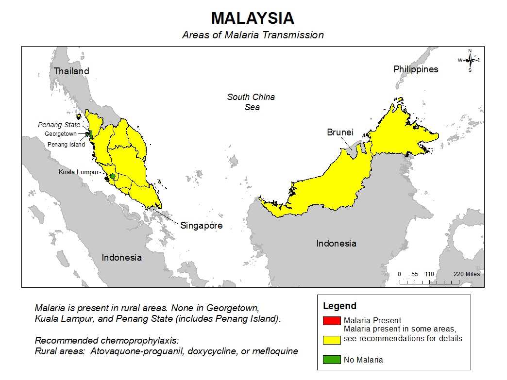 | Malaysia | Present in rural areas. None in Georgetown, Kuala Lampur, and Penang State (includes Penang Island). | Low | Chloroquine |