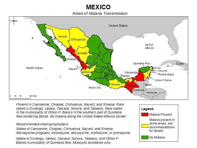 | Mexico | Present in Campeche, Chiapas, Chihuahua, Nayarit, and Sinaloa. Rare cases in Durango, Jalisco, Oaxaca, Sonora, and Tabasco. Rare cases in the municipality of Othon P. Blanco in the southern part of Quintana Roo bordering Belize. No malaria along the United States-Mexico border. | Very Low | None | P. vivax 100% | States of Campeche, Chiapas, Chihuahua, Nayarit, and Sinaloa: Atovaquone-proguanil, chloroquine, doxycycline, mefloquine, or primaquine7 . States of Durango, Jalisco, Oaxaca, Sonora, Tabasco, and Othon P. Blanco municipality of Quintana Roo: Mosquito avoidance only.
