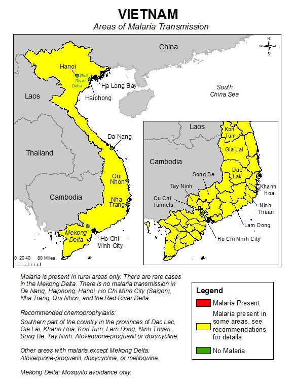| Vietnam | Rural areas only. Rare cases in the Mekong and Red River Deltas. None in the cities of Da Nang, Haiphong, Hanoi, Ho Chi Minh City (Saigon), Nha Trang, and Qui Nhon. | Low | Chloroquine and Mefloquine |