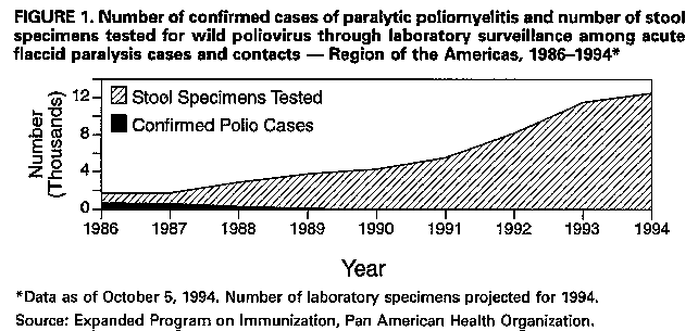 Persons using assistive technology might not be able to fully access information in this file. For assistance, please send e-mail to: mmwrq@cdc.gov. Type 508 Accommodation and the title of the report in the subject line of e-mail. International Notes Certification of Poliomyelitis Eradication -- the Americas, 1994In May 1985, the Pan American Health Organization (PAHO) proposed the goal of interruption of wild poliovirus transmission in the Western Hemisphere by 1990 (1). This proposal was endorsed by all member governments and was supported by several agencies and organizations, including Rotary International, the U.S. Agency for International Development, the United Nations Children's Fund, the Inter-American Development Bank, and the Canadian Public Health Association. On August 20, 1994, PAHO reported that 3 years had passed since the occurrence of the last case of poliomyelitis associated with wild poliovirus isolation in the Americas (Peru, August 1991) (2). This report summarizes the steps to certify eradication of polio in the Americas. In 1990, PAHO established an independent International Commission for the Certification of Poliomyelitis Eradication in the Americas (ICCPE) (3) to oversee the regional polio eradication efforts and to determine when the goal has been achieved. The ICCPE required three criteria before the Region of the Americas could be certified as polio-free: 1) high (i.e., more than 80%) levels of vaccination coverage with poliovirus vaccine, 2) adequate surveillance for polio cases (as defined by a series of specific indicators recommended by the ICCPE), and 3) at least 3 years without any confirmed polio cases (4). In early 1994, the 38 member countries formed 25 independent national certification commissions and one multinational commission for the English-speaking Caribbean countries to evaluate national data and to recommend to the ICCPE whether poliovirus transmission had been interrupted in their respective countries. Information reviewed by the National Certification Commissions included 1) trends in vaccination coverage; 2) national surveillance data obtained from an extensive regionwide surveillance system with more than 20,000 health units that report weekly on the presence or absence of cases of acute flaccid paralysis (suspected polio cases); and 3) laboratory results from the testing of stool specimens obtained from persons with suspected polio and their contacts for the presence of wild poliovirus. In 1993, regional vaccination coverage among children with at least three doses of oral poliovirus vaccine was 87%; 33 of 38 countries had achieved and maintained coverage of more than 80%. Routine vaccination has been supplemented by annual national immunization days *. Since August 21, 1991 (when the last confirmed case was reported), approximately 6000 acute flaccid paralysis cases have been investigated; however, none of these cases were confirmed as paralytic polio resulting from wild poliovirus. In addition, approximately 25,000 stool specimens obtained from these patients and their contacts were negative for wild poliovirus (Figure_1). Finally, key surveillance indicators have been at acceptable levels in all countries during the past 3 years. Based on review of these data, all 26 national or multinational certification commissions recommended that their countries be certified as polio-free. Based on recommendations of the national certification committees and after review of surveillance and laboratory data, on September 29, 1994, the ICCPE announced that wild poliovirus transmission has been interrupted in the Americas. Reported by: Expanded Program on Immunization, Pan American Health Organization, Washington, DC. Editorial NoteEditorial Note: The certification of the interruption of wild poliovirus transmission in the Americas is an important achievement in the global effort to eradicate poliovirus. In addition to successful vaccination strategies, other factors that contributed to this achievement included 1) the high level of political commitment of the member governments; 2) substantial community participation; and 3) strong collaboration among participating agencies and organizations through interagency coordinating committees. Although poliovirus transmission has been interrupted in the Americas, transmission of wild poliovirus continues in other parts of the world and creates an ongoing risk for the importation of wild poliovirus into the Americas (5). If importations occur, polio outbreaks may develop, especially in localities with low vaccination coverage and poor sanitation (6-8). As a result, the Region of the Americas must maintain high levels of vaccination coverage. Ongoing surveillance for acute flaccid paralysis cases and for the presence of wild poliovirus must be maintained. International communication and collaboration will continue to be necessary for the rapid detection of importations of wild poliovirus and timely implementation of control efforts. Only the global eradication of polio will ensure that the Region of the Americas remains polio-free. References