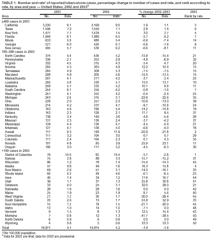 Persons using assistive technology might not be able to fully access information in this file. For assistance, please send e-mail to: mmwrq@cdc.gov. Type 508 Accommodation and the title of the report in the subject line of e-mail. Trends in Tuberculosis --- United States, 1998--2003Please note: An erratum has been published for this article. To view the erratum, please click here.During 2003, a total of 14,871 tuberculosis (TB) cases (5.1 cases per 100,000 population) were reported in the United States, representing a 1.4% decrease in cases and a 1.9% decline in the rate from 2002. This decline is the smallest since 1992, when TB incidence peaked after a 7-year resurgence. In addition, the rate remains higher than the national interim goal of 3.5 cases per 100,000 population that was set for 2000 (1). This report summarizes data from the national TB surveillance system for 2003 and describes trends during a 5-year period, with comparison to 1998 and 2002. Despite a decline in TB nationwide, rates have increased in certain states, and elevated TB rates continue to be reported in certain populations (e.g., foreign-born persons and racial/ethnic minorities). Targeted interventions for these at-risk populations, continued collaborative efforts toward the global fight against TB, and adequate local resources are essential to eliminating TB in the United States. The 50 states and the District of Columbia (DC) report cases to the national TB surveillance system at CDC by using a standard case definition and report form (2). Data were analyzed for cases reported during 1998--2003 by using reports updated as of February 24, 2004. A U.S.-born person was defined as someone born in the United States or its associated jurisdictions, or someone born in a foreign country but having at least one U.S.-born parent; other persons were classified as foreign-born. U.S. Census population estimates were used to calculate national and state TB rates for 2003 (3), and the Current Population Survey (March 2002) was used to extrapolate the total U.S.-born and foreign-born populations for 2003 (4). The 2002 U.S. Census population estimates were used to extrapolate and calculate race/ethnicity TB rates for 2003 (5,6). U.S. Census Bureau national population estimates were used to calculate the U.S.-born, foreign-born, and racial/ethnic populations for 1998 (7,8). During 2003, a total of 12 states and DC reported rates above the national average (5.1 cases per 100,000 population), and 24 states met the definition for low incidence (<3.5 cases per 100,000 population) (Table 1). Among the 19 states that reported increases in cases during 2002--2003, California, New York, and Texas accounted for 42.4% of the 2003 national case total. Among those areas reporting <100 cases in 2003, only Alaska and DC had rates higher than the national average (Table 1). In 2003, foreign-born persons accounted for 53.3% (7,845 cases) of the national case total, and 25 states reported >50% of their cases among foreign-born persons. The foreign-born prevalence represents an increase from 1998, when foreign-born persons accounted for 41.7% (7,598) of TB cases nationwide, and 13 states reported >50% of their cases among foreign-born persons. The 2003 TB rate among foreign-born persons (23.4 cases per 100,000 population) was 8.7 times greater than that among U.S.-born persons (2.7 cases per 100,000 population), representing an increased rate ratio from 1998 (7.0) and from 2002 (8.0). For the top three reporting states (California, New York, and Texas), the 1998--2003 decrease in cases among U.S.-born persons (32.2%; from 3,179 to 2,155) was four times greater than the decrease among foreign-born persons (7.6%; from 4,420 to 4,086). In 2003, the five birth countries of foreign-born patients with TB reported most commonly were Mexico (25.6%), the Philippines (11.6%), Vietnam (8.4%), India (7.7%), and China (4.8%). TB patients from certain countries were concentrated in certain states. For example, New York reported 56.1% of the national total born in Ecuador, Minnesota reported 55.2% of patients born in Somalia, California reported 52.3% of patients born in the Philippines, and Florida reported 49.4% of patients born in Haiti. Among 6,429 foreign-born TB patients aged >15 years, 3,410 (53.0%) had resided in the United States >5 years before TB diagnosis, 1,778 (27.7%) resided in the United States 1--4 years, and 1,241 (19.3%) resided in the United States <1 year. Disparities in TB rates persist among racial/ethnic minority populations. In 2003, two modifications were made to the TB report form: 1) multiple race entries were allowed, with 0.3% selecting more than one race, and 2) the previous category of Asian/Pacific Islander was divided into "Asian" and "Native Hawaiian or Other Pacific Islander." During 2003, the highest rates were reported among racial/ethnic minority populations (Table 2). The non-Hispanic black population had the largest number of TB cases (3,041 cases, 45.0%). During 2003, drug resistance among initial isolates of Mycobacterium tuberculosis in persons with no previous TB episodes was more common in foreign-born patients than in U.S.-born patients. With 82.3% of data on drug-susceptibility testing complete, multidrug resistance (i.e., resistance to at least isoniazid and rifampin) among foreign-born persons was 1.2% (U.S.-born: 0.6%). During the preceding 5 years, the proportion of multidrug-resistant TB has been stable (1998: foreign-born, 1.3% and U.S.-born, 0.7%). In 2000, a total of 80.8% of reported TB patients completed therapy in <1 year, and 92.2% completed therapy overall. Reported by: Div of Tuberculosis Elimination, National Center for HIV, STD, and TB Prevention, CDC. Editorial Note:During 1993--2002, the average year-to-year decrease in TB rate was 6.8%. However, 2003 had the smallest annual decrease (1.9%), raising concern about a possible slowing of the progress against TB. During the preceding decade, certain