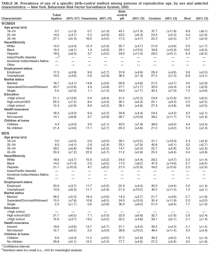 The material in this report originated in the National Center for Chronic Disease Prevention and Health Promotion, Janet L. Collins, MD, Director; and the Division of Reproductive Health, John Lehnherr, Acting Director. Corresponding author: Diana M. Bensyl, PhD, Office of Workforce and Career Development, 1600 Clifton Rd, MS E-92, Atlanta, GA 30333. Telephone: 404-498-6153; Fax: 404-498-6355; E-mail: dbensyl@cdc.gov. AbstractProblem: Contraceptive use is an important determinant of unintended pregnancy. In the United States, approximately half of all pregnancies are unintended. Population-based information about contraceptive use patterns is limited at the state level. Information about contraceptive use for states can be used to guide the development of state programs and policies to decrease unintended pregnancy and the spread of sexually transmitted infections. Information about contraceptive use for specific subpopulations can be used to further refine state efforts to improve contraceptive use and subsequently decrease the occurrence of unintended pregnancy. Reporting Period: Data were collected in 2002 for men and women. Description of System: The Behavioral Risk Factor Surveillance System (BRFSS) is a random-digit--dialed, telephone survey of the noninstitutionalized U.S. population aged >18 years. All 50 states, the District of Columbia, Guam, the Commonwealth of Puerto Rico, and the U.S. Virgin Islands participated in BRFSS in 2002. These data can be used to track state progress towards the national health objectives for 2010 for responsible sexual behavior. The 2002 BRFSS data represent the first time state data on contraceptive use in all 50 states will be presented and examined by selected sociodemographic characteristics. The 2002 BRFSS also, for the first time, provided an opportunity to examine state-level contraceptive use patterns among men. Results: Variation across states and territories was observed for the majority of contraceptive methods among the different demographics analyzed and among men and women. The percentage of men and women at risk for pregnancy who said they or their partner was using birth control was high overall and ranged from 67% (Guam) to 88% (Idaho). Oral contraceptives (i.e., the pill), vasectomy, tubal ligation, and condoms were the methods most frequently reported by both male and female respondents who said they or their partner was using birth control. Among female respondents using birth control, the pill was the most common method reported. Among men, vasectomy was the most commonly reported method. The prevalence of use for the four most commonly reported methods (pills, vasectomy, tubal ligation, condoms) varied as much as six-fold among states for vasectomy and three- to four-fold for condoms, pills, and tubal ligation. Interpretation: The findings in this report document substantial differences among states and sociodemographic groups within states in contraceptive method use. Public Health Action: These data can help states identify populations with an unmet need for birth control, barriers to birth control use, and gaps in the range of birth control methods offered by health-care providers. An analysis of the prevalence of birth control use by state and selected population characteristics can help states target contraceptive programs to best meet the needs of their population. IntroductionIn the United States, approximately 49% of all pregnancies and 30% of live births in 1994 were unintended, either mistimed or unwanted, at the time of pregnancy (1). Unintended pregnancies are associated with poor maternal-child health outcomes and behaviors such as smoking and drinking during pregnancy, delayed prenatal care, and low birthweight (2). As a result, the reduction of unintended pregnancies is one of the family planning objectives of the national health objectives for 2010 (3). Specifically, the objective is to increase the proportion of pregnancies that are intended to 70%. Another objective is to increase the proportion of females at risk for unintended pregnancy (and their partners) who use contraception to 100%. Consistent use of effective birth control methods is the primary strategy for preventing unintended pregnancies among sexually active persons. Patterns of contraceptive use by state reflect the availability of publicly supported reproductive health services, preferences of women and health-care providers, and willingness of insurers to cover specific methods. Eliminating barriers to access and to effective use of contraception will help meet the health objectives for 2010. This report summarizes data from the 2002 Behavioral Risk Factor Surveillance System (BRFSS) survey, the first survey to provide population-based information for all states and territories about birth control use for the prevention of pregnancy among both women and men of reproductive age. BRFSS is the only population-based data source that provides basic information for comparing birth control use among states and for informing state-level policy and program development. The National Survey of Family Growth provides more detailed estimates of birth control use and related reproductive health issues on a national and regional level (4). This report focuses on the prevalence of birth control use for those reporting the following five methods: the pill, condoms, tubal ligation, vasectomy, and injectable contraceptives (e.g., Depo-Provera ["the shot"]). These methods account for 83%--93% of birth control use for men and 84%--95% of birth control use for women. MethodsBRFSS comprises population-based telephone surveys administered annually in all 50 U.S. states and four territories among men and women aged >18 years, to collect surveillance data about a range of health behaviors and risk factors; the survey is administered in English and other languages where appropriate and feasible (5). No data are reported where sample sizes for demographic characteristics