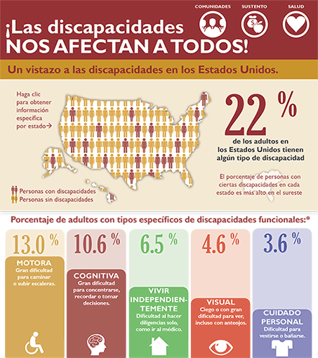 El Informe Semanal de Morbilidad y Mortalidad (MMWR) publicó un nuevo reporte que describe el porcentaje de adultos con discapacidades en los Estados Unidos que viven en las comunidades. Este reporte está basado en preguntas utilizadas por primera vez en el Sistema de Vigilancia de Factores de Riesgo del Comportamiento (BRFSS) del 2013, las cuales permiten que los entrevistados identifiquen tipos de discapacidades funcionales específicos, como motoras (gran dificultad para caminar o subir escaleras), cognitivas (gran dificultad para concentrarse, recordar o tomar decisiones), visuales (gran dificultad para ver) y discapacidades sobre el cuidado personal (dificultad para vestirse o bañarse) y sobre vivir de manera independiente (dificultad para hacer diligencias solo). De acuerdo con este reporte, más de 53 millones de adultos que viven en comunidades en los Estados Unidos tienen una discapacidad. Los porcentajes más altos generalmente se encuentran en los estados del sur y los más bajos en su mayoría están en los estados del Medio Oeste y de las Montañas Rocosas. Aunque cualquier persona puede tener una discapacidad y esta puede ocurrir en cualquier momento de la vida, los que más frecuentemente reportaron tener discapacidades fueron las mujeres, las personas de edad avanzada (65 años o más) y las personas de grupos raciales o étnicos minoritarios. Si bien se ha avanzado desde la aprobación de la Ley sobre Estadounidenses con Discapacidades (ADA), hace veinticinco años, para darles a las personas con discapacidades mejores oportunidades de lograr su potencial, los estudios muestran de manera constante que estas personas tienen más mala salud que las que no tienen discapacidades y que muchos de los problemas relacionados con su mala salud se pueden prevenir. Esta edición del MMWR presenta información importante que los funcionarios de salud pública y otras personas pueden usar para ayudar a comprender y abordar las necesidades de las personas con discapacidades en los Estados Unidos.