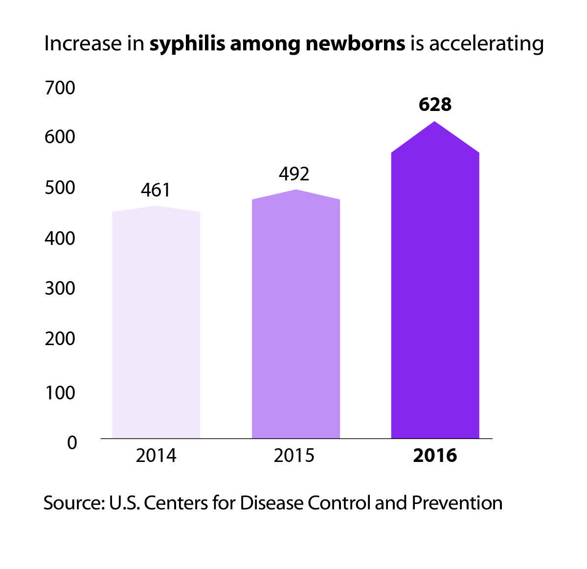The increase in the number of cases of syphilis among newborns between 2014 and 2016 has accelerated. In 2014 there were 461 reported cases of congenital syphilis, in 2015 there were 492 reported cases of congenital syphilis, and in 2016 there 628 reported cases of congenital syphilis. This surge threatens the health of a new generation of Americans.