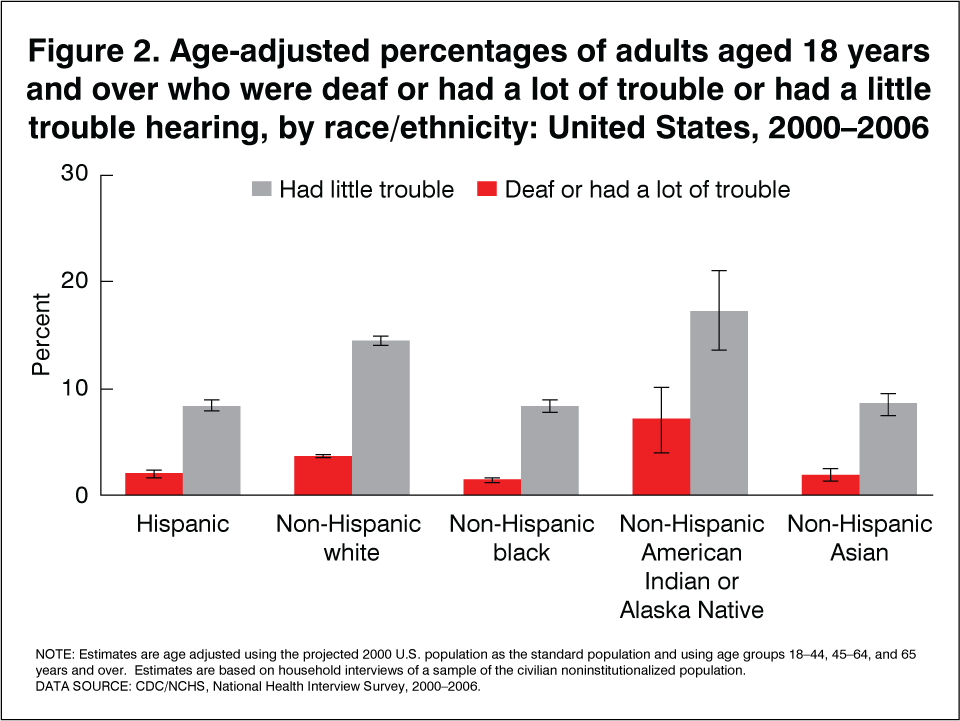 | Race and ethnicity3 | Total2 | Good hearing | A little trouble hearing | Deaf or a lot of trouble hearing |