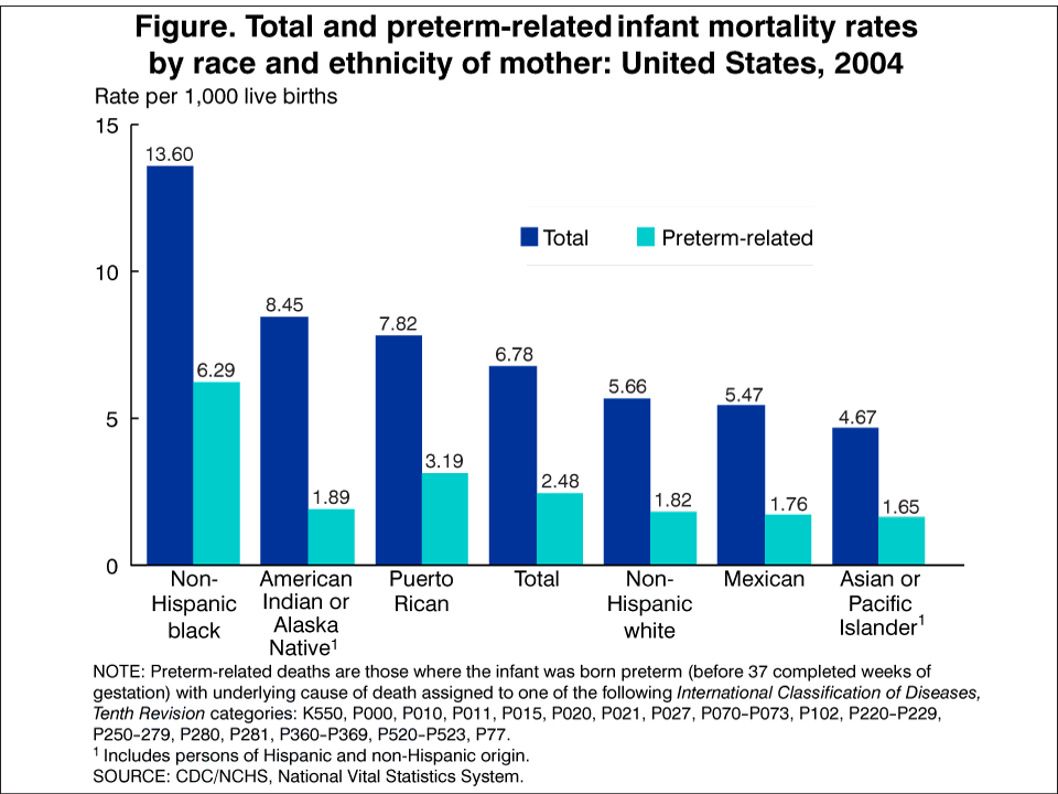 Results – In 2004, 36.5% of all infant deaths in the United States were preterm-related, up from 35.4% in 1999. The preterm-related infant mortality rate for non-Hispanic black mothers was 3.5 times higher and the rate for Puerto Rican mothers was 75% higher than for non-Hispanic white mothers. The preterm-related infant mortality rate for non-Hispanic black mothers was higher than the total infant mortality rate for non-Hispanic white, Mexican, and Asian or Pacific Islander (API) mothers.