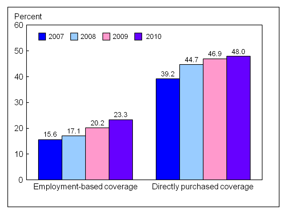Based on data from 2010, among persons under age 65 with private health insurance, 23.3% with employment-based coverage were enrolled in a HDHP, compared with 48.0% of those with a private plan that was directly purchased or obtained through means other than employment (Figure 4). The percentage of persons covered by employment-based private plans who were enrolled in HDHPs increased from 15.6% in 2007 to 23.3% in 2010. The percentage of persons covered by directly purchased private health plans who were enrolled in HDHPs increased from 39.2% in 2007 to 48.0% in 2010. For persons under age 65, approximately 8% of private health plans were directly purchased (estimates not shown). HDHPs constitute a growing share of both employment-based and directly purchased health plans.