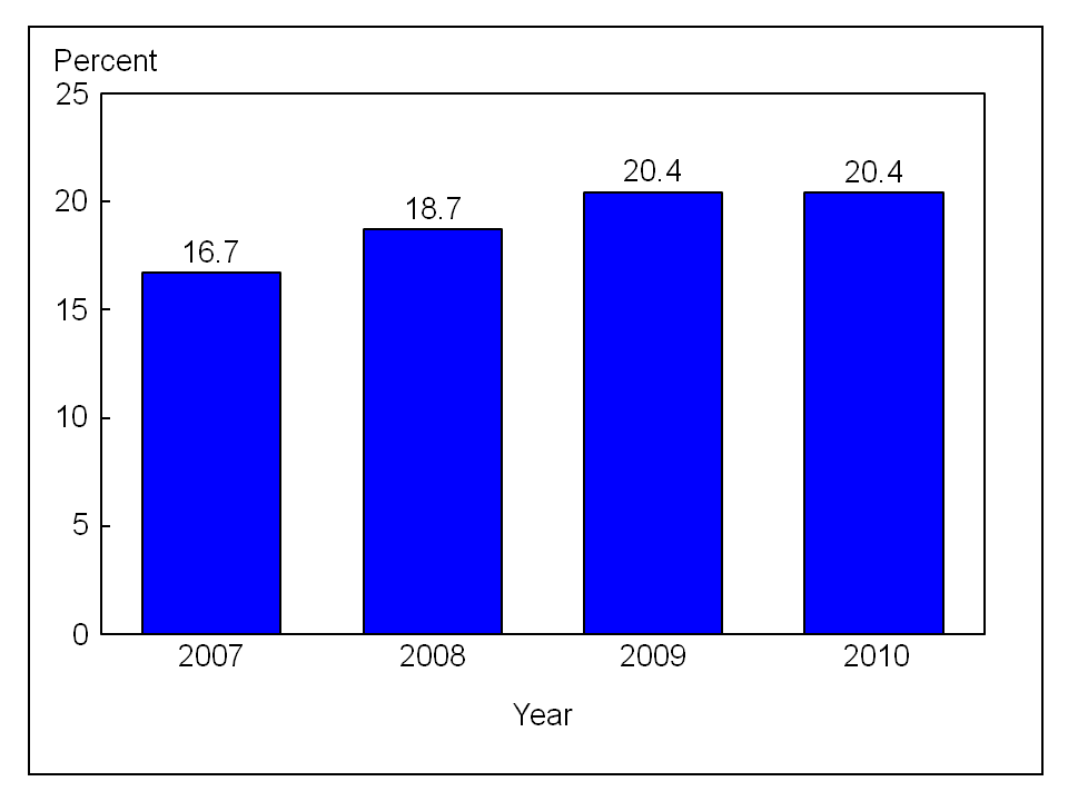 In 2010, among persons under age 65 with private health insurance, 20.4% were in a family that had a FSA for medical expenses (Figure 5). (See Technical Notes for definition of FSA.) This is an increase from 2007, when 16.7% of persons under age 65 with private insurance were in a family with a FSA.