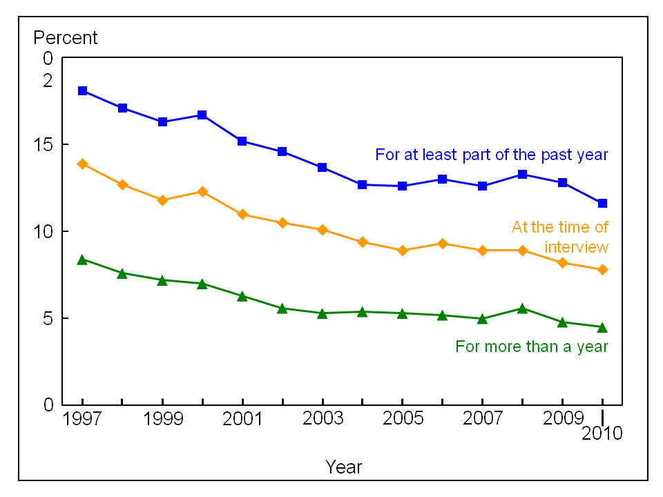 The percentage of poor children who were uninsured at the time of interview decreased from 1997 through 2010 (Figure 9). During the same period, the percentage of poor adults who were uninsured remained relatively stable (Figure 10).