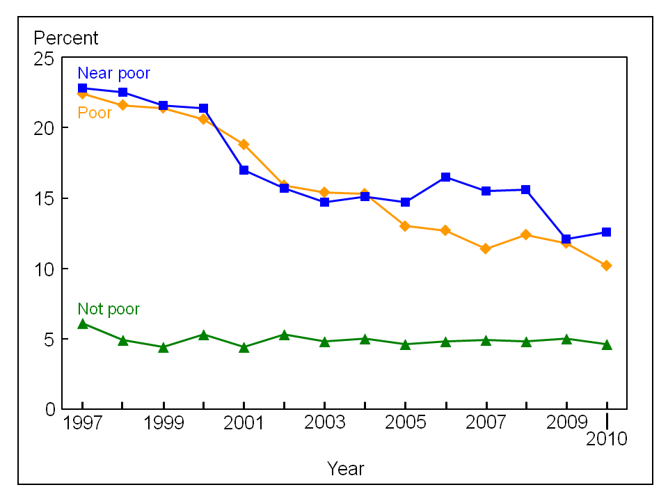 In 2010, 10.2% of poor children and 12.6% of near poor children (see Technical Notes for definition of poverty) did not have health insurance coverage at the time of interview (Table 4). In 2010, 42.2% of poor and 43.0% of near poor adults aged 18–64 years lacked coverage at the time of interview. The percentage of near poor adults aged 18–64 who lacked coverage at the time of interview increased from 39.1% in 2009 to 43.0% in 2010.