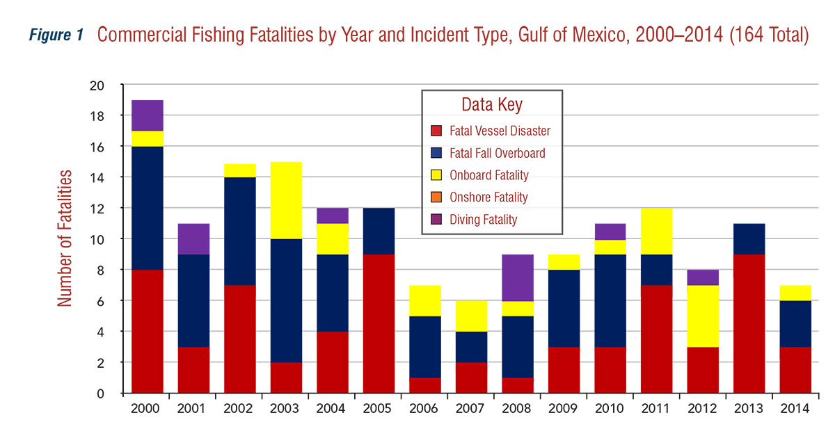During the 15-year period 2000–2014, 164 commercial fishing deaths due to traumatic injury occurred in Gulf of Mexico fisheries, averaging almost 11 fatalities annually (Figure 1). During the first decade (2000–2009), 115 fatalities occurred, for an average of nearly 12 deaths per year. For the most recent five-year period (2010–2014), 49 fatalities were recorded, averaging 10 fatalities annually. During 2000–2009, the leading cause of fatalities in the region was falling overboard; however, during 2010–2014, the leading cause of fatalities was vessel disasters.