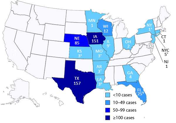 A total of 425 cases of Cyclospora infection have been reported from 16 states and 1 city. The number of cases identified in each area is as follows: Texas (127), Iowa (148), Nebraska (84), Florida (25)¶, Wisconsin (12), Illinois (5)†, Arkansas (2), New York City (5)†, Georgia (4), Missouri (2)†, Kansas (3)‡, Louisiana (3)‡, New Jersey (1), Ohio (1), Connecticut (1), Minnesota (1) and New York (1)†.